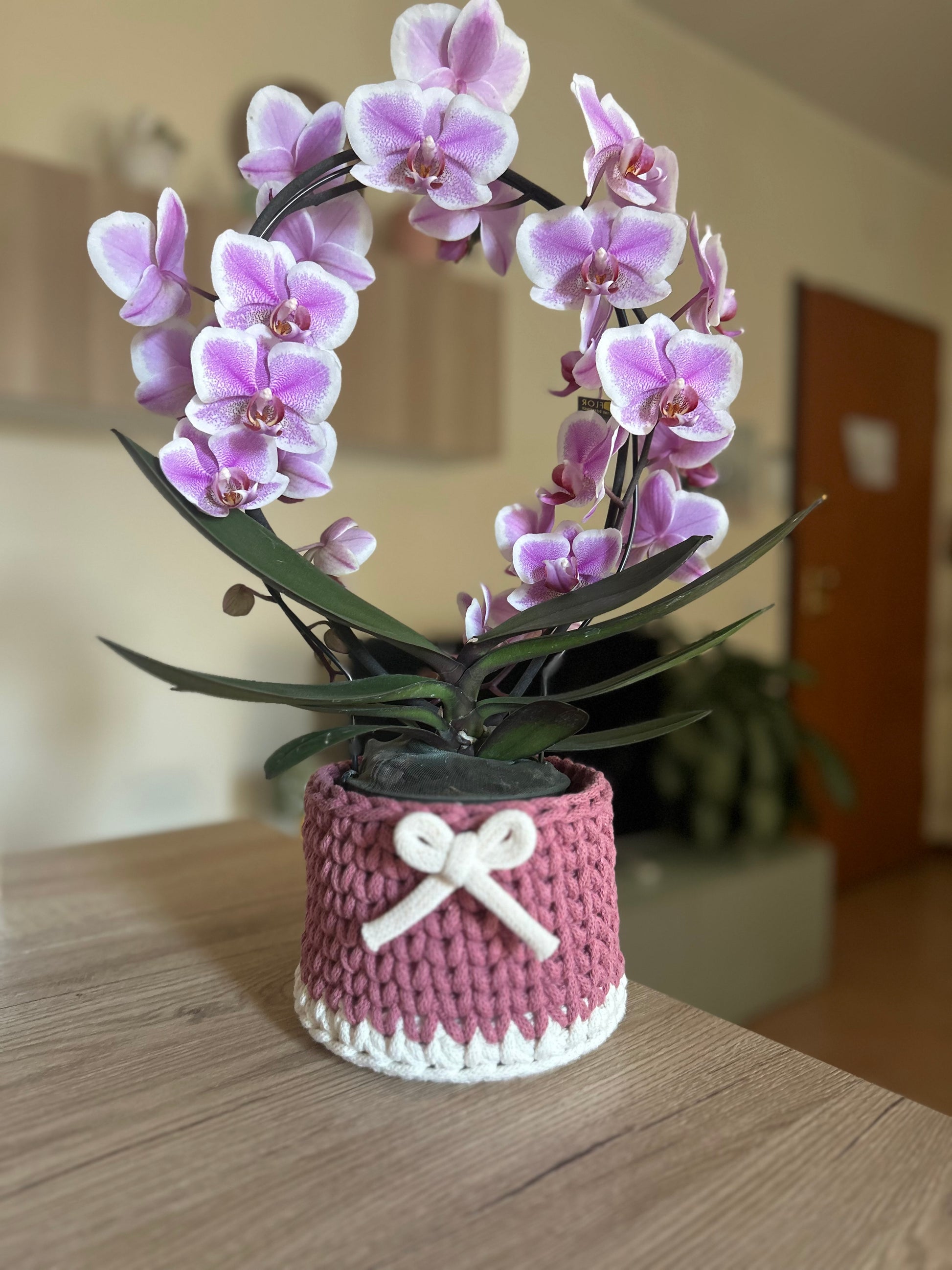 Diametro 20 cm altezza circa 11 cm con possibilità di inserire il nome in tricotin