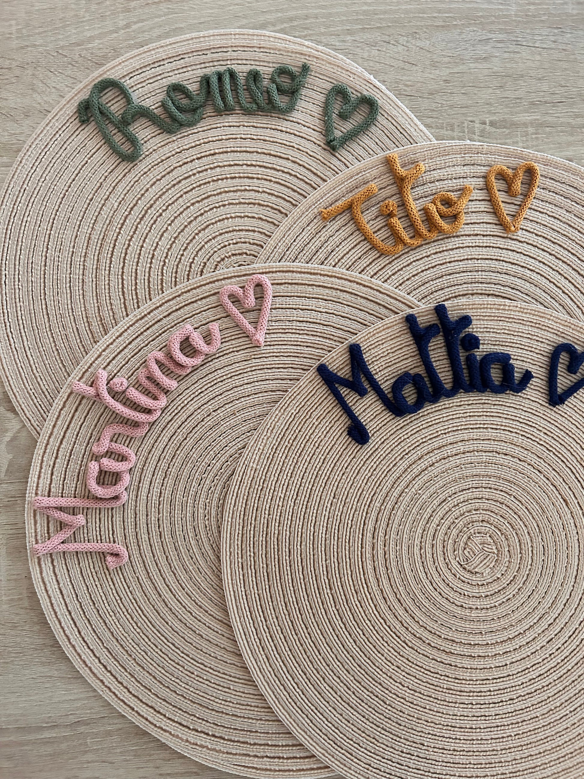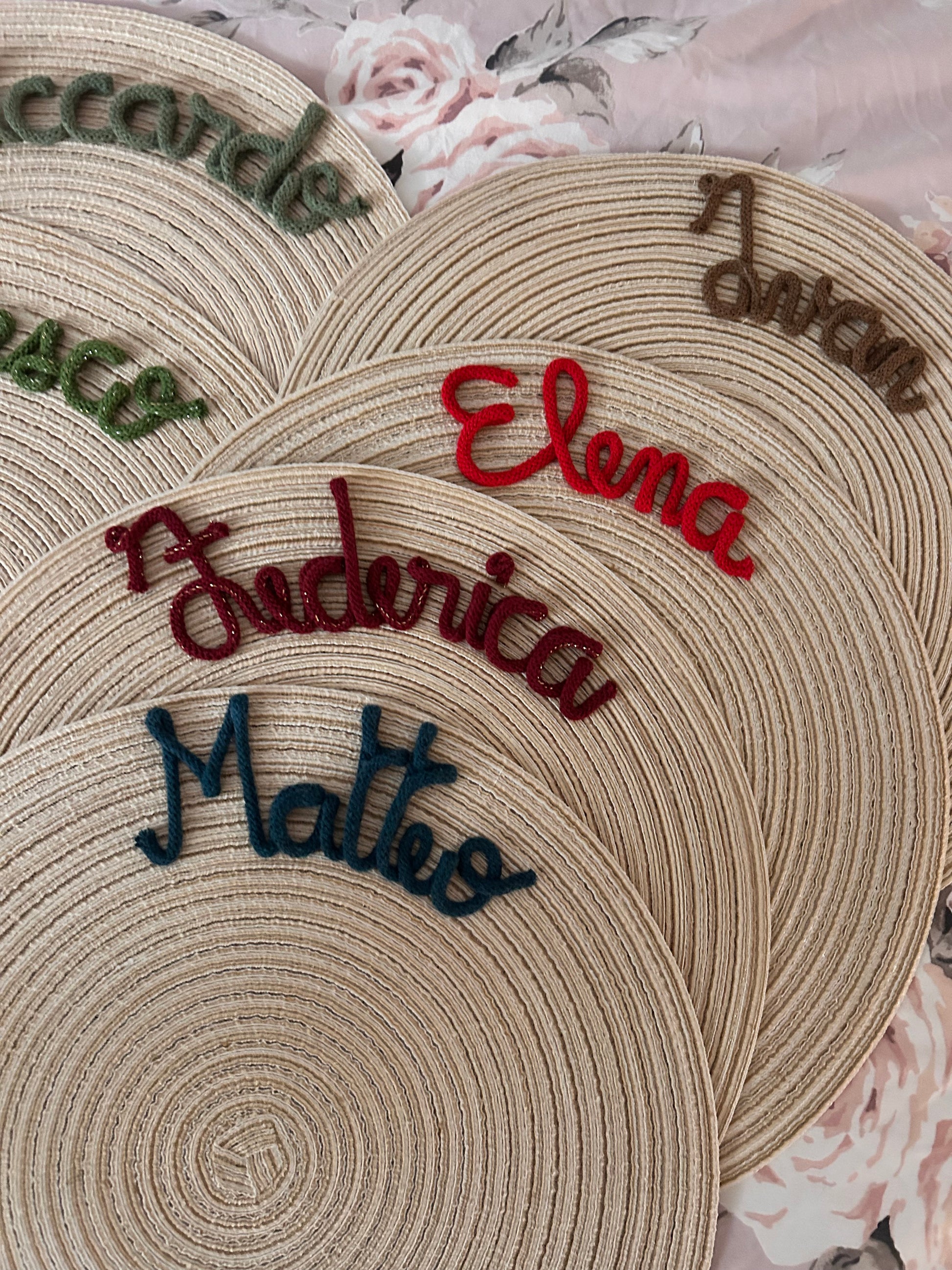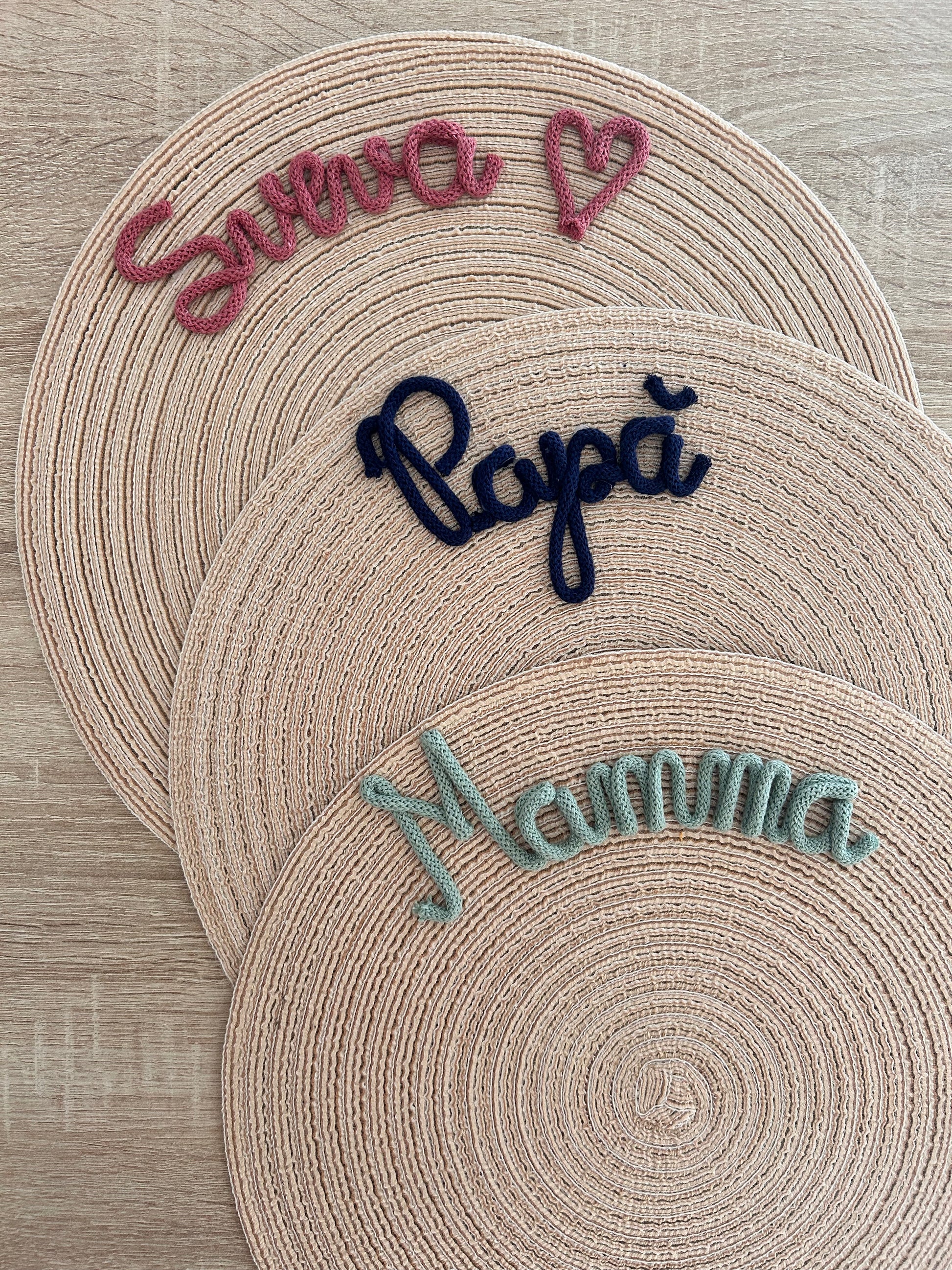 Tovaglietta rotonda o sottopiatto personalizzabile con nome in tricotin.