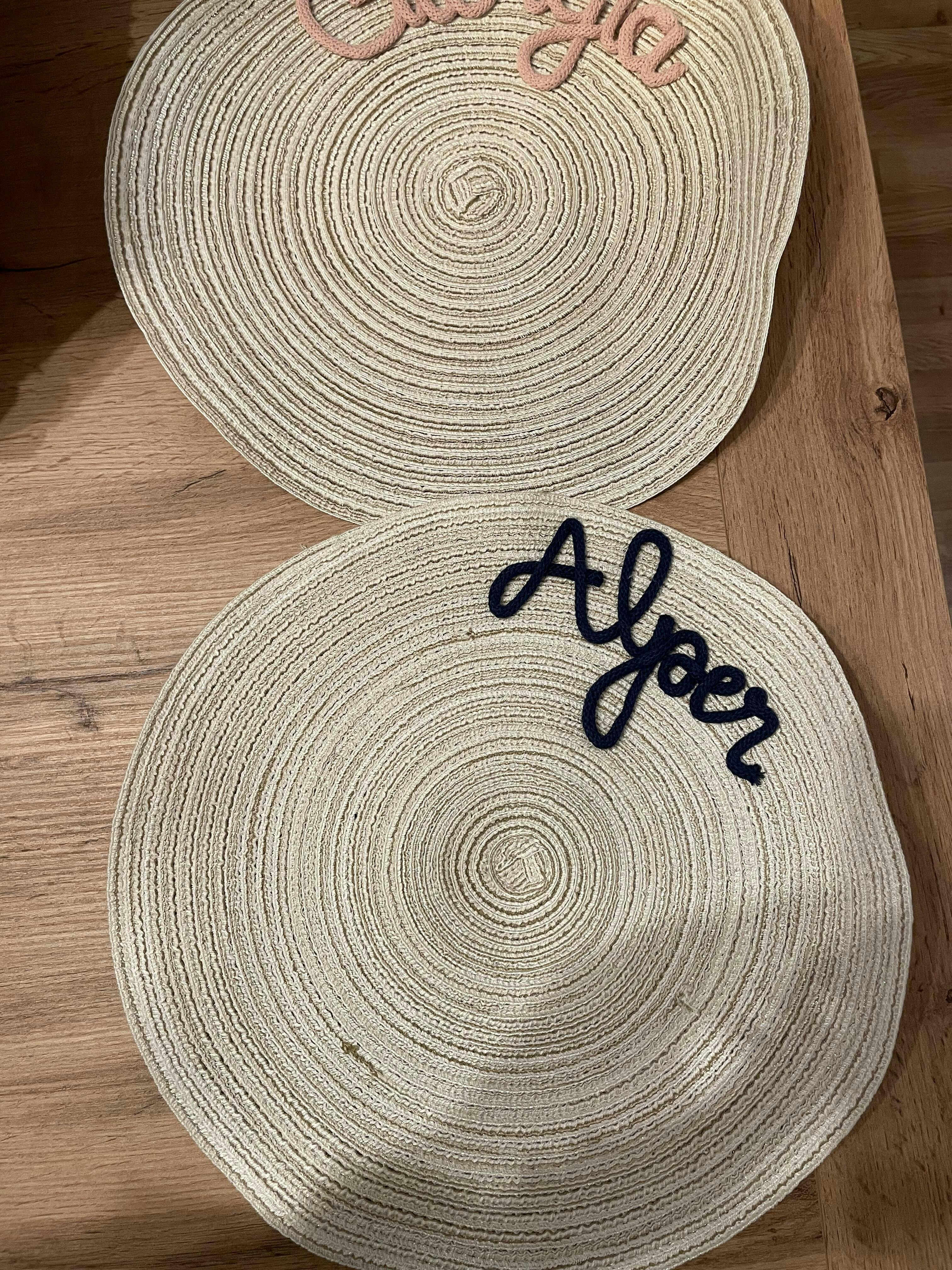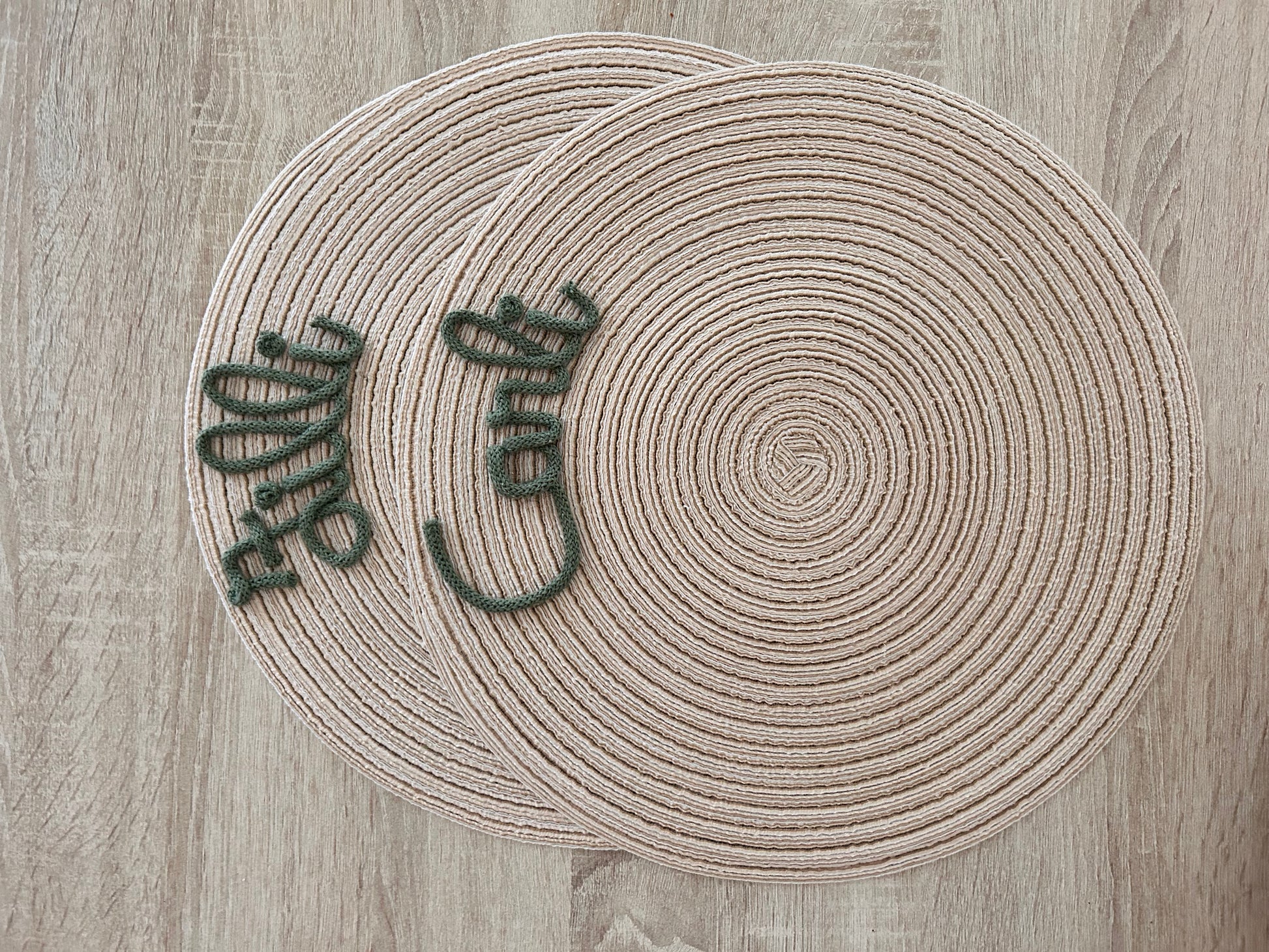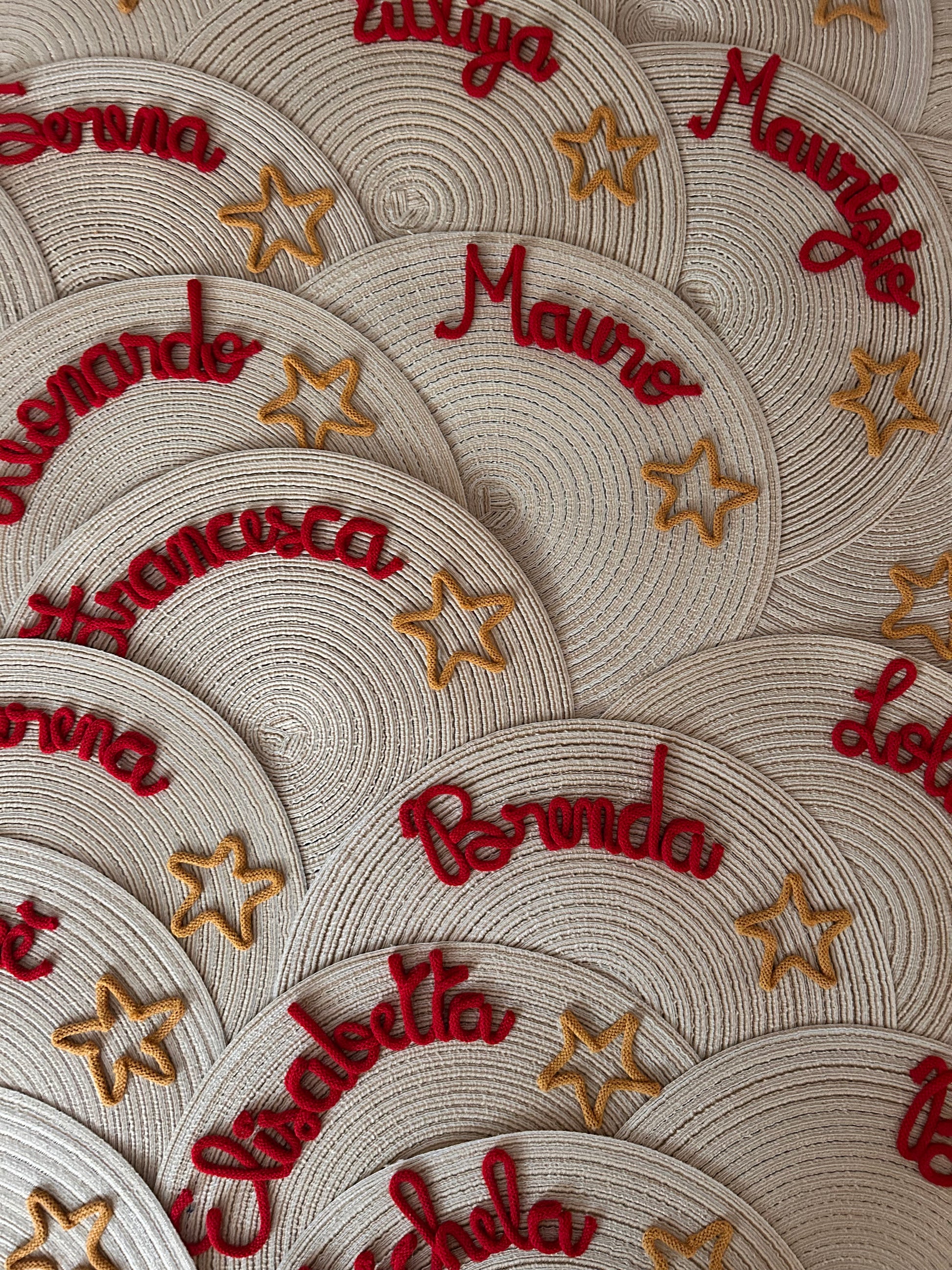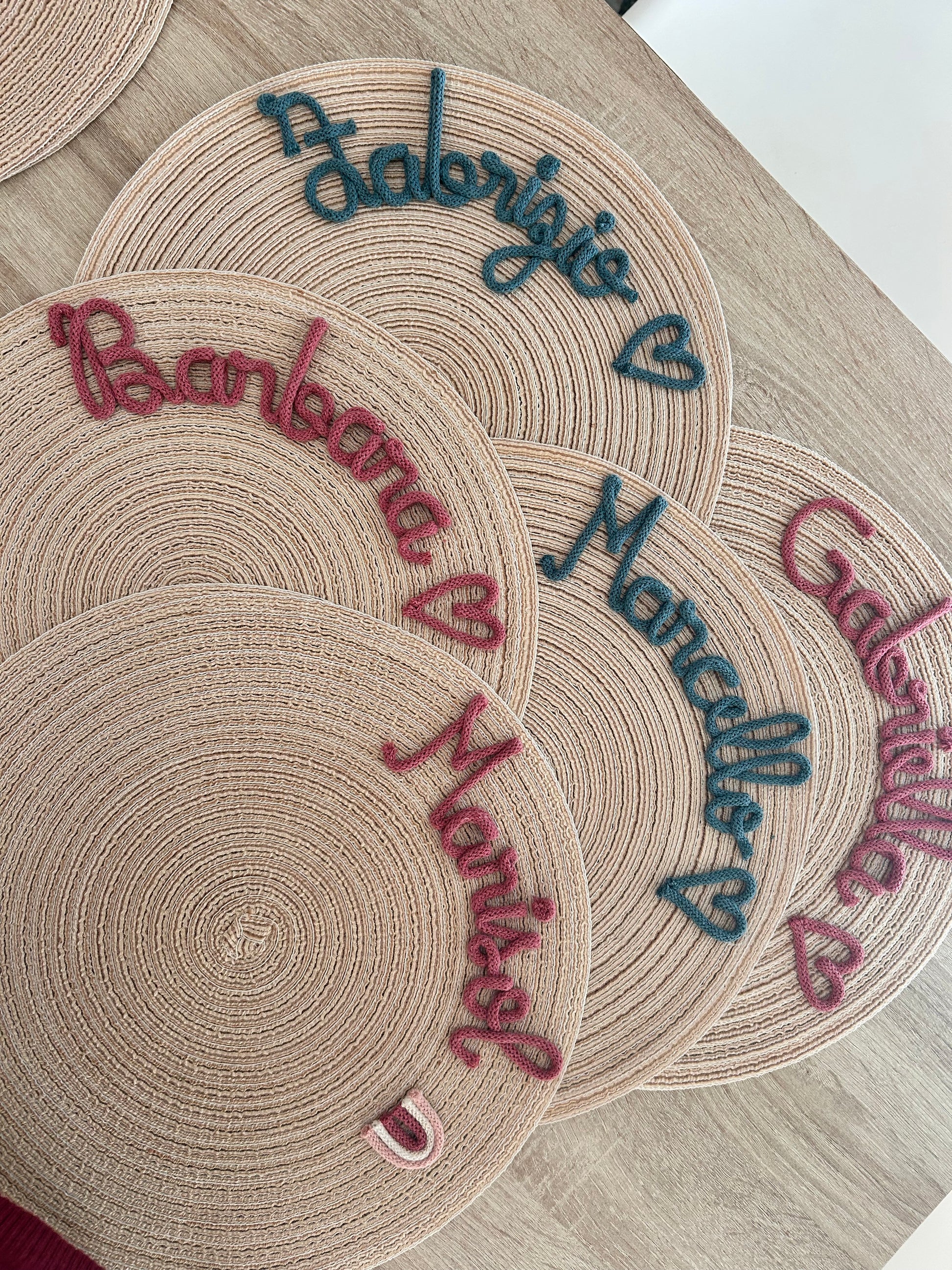 Tovaglietta rotonda o sottopiatto personalizzabile con nome in tricotin.